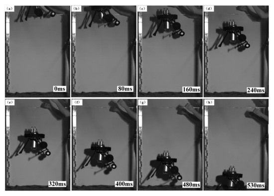 Figure 9 is a representative time sequence of aerial pitch control experiments (Experiment No. 4, Group 1). Figure 10 shows the jumping robot’s pitch angle curves of the aerial pitch control experiment, each curve started at the moment when the robot began to fall and ended at the moment when it contacted the ground. It can be seen from Figure 9 that the attitude sensor module detected the robot’s acceleration variation when the robot started falling freely, thus the assistant legs were driven to rotate a theoretical angle Δθt = −48.5°. During the rotation of the assistant legs, the main body’s pitch angle also increased from the initial value −17.3°. According to Figure 10a, the robot’s pitch angle reached 0° at 422 ms and then 1.81° at 531 ms when the robot contacted the ground. After landing, the assistant legs reset to their initial position (parallel to the central axis of the water jet thruster), and the aerial pitch control process was completed.