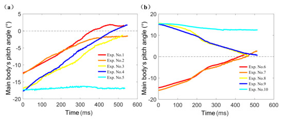 As the expected value of pitch angle is 0°, it can be known from Figure 10 that the absolute values of maximum error of pitch angle in Group 1 and Group 2 were 1.81° (Experiment No. 4) and 2.79° (Experiment No. 6) respectively. However, the pitch angle did not change obviously in Experiment No. 5 and Experiment No. 10 which did not conduct aerial pitch control movements.