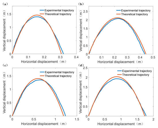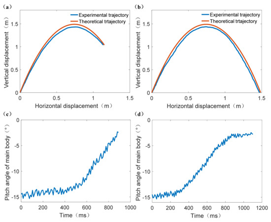 After the outdoor terrestrial jumping experiment, the four experimental jumping trajectories can be obtained and their comparisons with corresponding theoretical jumping trajectories were shown in Figure 11. Therefore, the RMSE of each experimental jumping trajectory can be calculated to evaluate its accuracy. The calculation results of RMSE for Figure 11a–d were: RMSEa = 0.057 m, RMSEb = 0.095 m, RMSEc = 0.074, RMSEd = 0.071 m, respectively. The maximum average degree of deviation in vertical displacement was 0.095 m, thus it can be concluded that the error between experimental jumping trajectory and theoretical jumping trajectory was small.