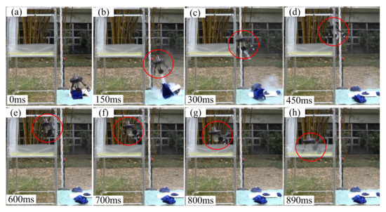 After the accuracy of robot’s experimental jumping trajectory was verified, the obstacle-crossing experiments can be conducted with the third optimized take-off parameters whose priority was landing safety. These experiments were meant to verify the robot’s abilities of obstacle-crossing and aerial pitch control. Similarly, the volume of propellant water inside the water jet thruster’s inner tank was 580 mL, and the jumping robot’s total mass was 4.36 kg. As the optimized take-off parameters of the experiments of jumping onto the platform and jumping over the platform were both φ0 = 76.0° and v0 = 5.57 m/s, then the corresponding maximum pressurization pressure of the water jet thruster was 1.89 MPa.