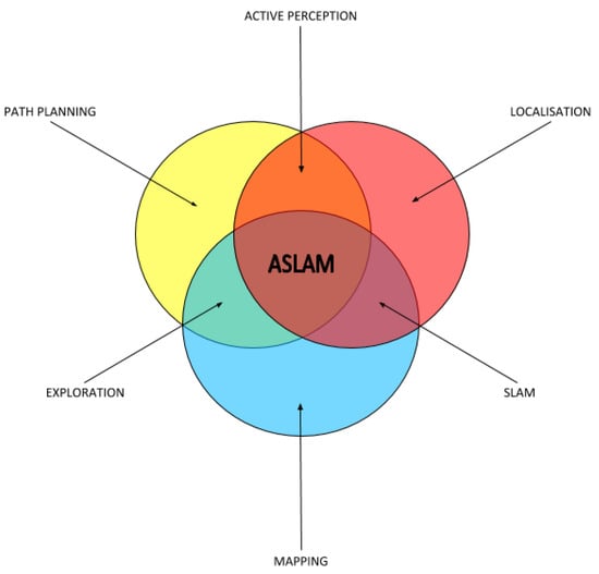 Components that form the Active Simultaneous Localization And Mapping (ASLAM) problem, expressed as set theory. Overlapping areas represent the combination of individual tasks.