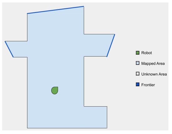 Concerning dimensionality reduction and mapped space, a concept that is widely used in the context of exploration is that of a frontier [,,]. Frontiers are regions on the boundary between open space and unexplored space, i.e., points in the map between the free known space and the unknown space. The main idea behind these points is that, as they are in the mapped space, it is very probable that the robot can reach them. In addition, they ensure that unexplored areas next to them can be covered. Frontiers, thus, represent optimal sets of points to be reached in order to expand the explored environment. An example of a map with all the frontiers identified is shown in Figure 2.