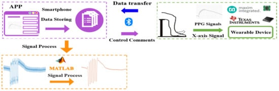 Figure 1 shows the architecture of the DVT examination system. The purple block is the APP that can display and store the LRR signals in real time, show the rhythm of dorsiflexion, and control the wearable device. The green block represents the wearable device that uses Bluetooth communication to receive APP comments and send the LRR data to the APP. The reflective PPG sensors and accelerometer are utilized to measure the LRR and the foot action signals, respectively. The orange block denotes the recorded LRR signals and the x-axis signal of the accelerometer that are uploaded to a personal computer for further smoothing of the LRR signals and for acquiring the characteristic parameters from the LRR signals with Matlab R2015a version.