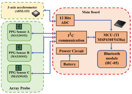 Figure 2 shows the block diagram of the LRR wearable device that includes an array-type probe, accelerometer, and main board. The array-type probe consists of three MAX30102 PPG sensors (Maxim Integrated TM, San Jose, CA, USA), whose size is 16 mm × 45 mm, as shown in Figure 3a. Each MAX30102 PPG sensor contains two light-emitting diodes (LEDs), with wavelengths of 660 nm (red light) and 880 nm (infrared light). Moreover, a photo diode, an 18-bit analog-to-digital converter, and low-noise electronics with ambient light rejection are also included in this PPG sensor. Communication between the sensors and a microcontroller unit (MCU) is accomplished via a standard I2C-compatible interface. The sampling rate is set to 100 Hz. The x-axis signal of the accelerometer (ADXL325, Analog Devices, Norwood, MA, USA) is sampled by the MCU with a 12-bit analog-to-digital converter. The MCU of the main board is a 16-bit microcontroller (MSP430F5438A, Texas Instruments TM, Dallas, TX, USA), which reconciles the workflow of the MAX30102 and ADXL325, performs the signal processing to obtain the DVT-related parameters, and transmits the data to the APP by a Bluetooth module (HC-05, Itead, Shenzhen, China). The power circuit includes a Li battery (150 mAh), a charging integrated circuit (IC) (TIBQ24072), and a regulator IC (XC62FP, 3.3 V). The size of the main board is 54 mm × 70 mm. Figure 3b shows the real picture of the LRR wearable device.