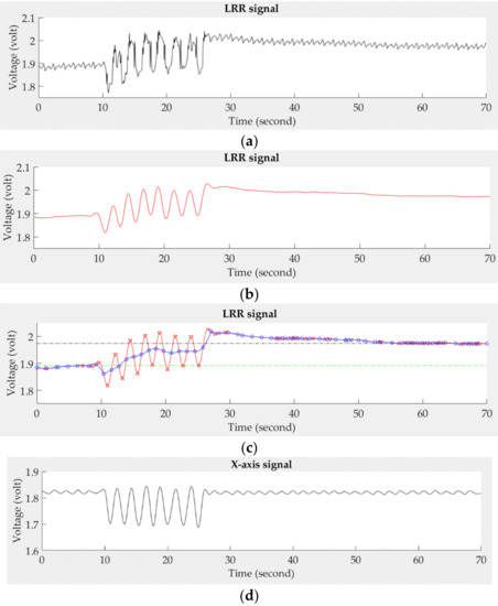 The signal processing steps for a normal LRR signal, (a) original signal, (b) the filtered signal, (c) the smooth (blue line) and filtered (red line) signals, (d) the synchronous x-axis signal.