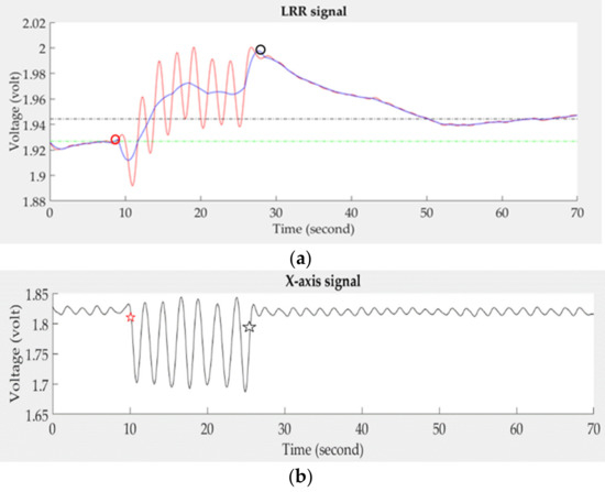 Figure 5a shows four characteristics in the smooth LRR signal (blue line), the start (red circle symbol), and the end (black circle symbol) points in the emptying phase, and the two baselines (short green dash line and long blue dash line) in the resting and refilling phase. The filtered LRR signal is represented by the red line. In Figure 5b, we find that the x-axis signal has larger alternating amplitudes in the emptying phase than those in the resting and refilling phases. Thus, the first maximum negative and last positive changed points of the x-axis signal is used to define the start and end points, Xstart and Xend (red and black star symbols), in the emptying phase. Then, the start maximum point of the smooth LRR signal, LRRstart (red circle symbol), is found between before and after 50 points of Xstart, and the end maximum point of the smooth LRR signal, LRRend (black circle symbol), is found between before and after 50 points of Xend, as shown in Figure 5a.