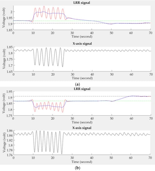 (a) The phase angle between the LRR signal and the x-axis signal is 180° because the PPG sensor detects the upstream of venous blood flow, (b) The LRR signal has the drift phenomenon.