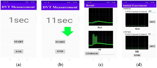 In the study, an APP program is designed to control the functions of the wearable device (Figure 7a), to instruct the rhythm of foot action (Figure 7b), and to display the results of the LRR signal in real time (Figure 7c). In the beginning, the APP program searches for the Bluetooth (BT) module of the wearable device and automatically connects with it. Users can adjust the LED current to shift the baseline of the LRR curve, as shown in Figure 7d. Then, the APP starts the DVT measurements, as shown in Figure 7a.