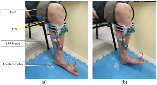 Real photo of LRR measurement: (a) placement of the cuff, LRR probe, and accelerometer, (b) the foot action.