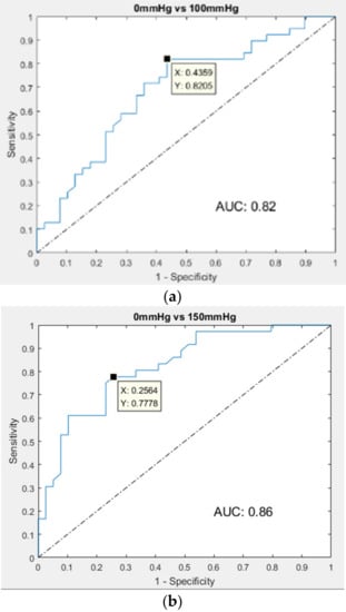 The LRR technique has been used in several studies for the noninvasive examination of patients with suspected lower limb DVT [28,29]. The technique uses the parameters of the LRR curve, such as the amplitude and rate of venous emptying [30], the time of venous refilling [28], and the shape of the LRR curve [16]. Tan et al. proposed using the amplitude of venous emptying and time of venous refilling to test DVT diagnosis and found that the two parameters achieved an optimal sensitivity of 100% and 100%, and specificities of 35% and 47%, respectively. Additionally, the areas under the ROC curves for the two parameters are 0.74 and 0.75, respectively [29]. In the present study, one of our findings is that the performance of the IR-light measurement is better than that of the R-light measurement (Table 2 and Table 3). The reason for this is partially due to deeper penetrating tissue by the IR light than by the red light [31]. Thus, the LRR signal with the IR-light measurement has a higher sensitivity for the positive DVT group. The accuracies and ROC areas of m40 and m10 in the serious DVT scenario are 76% and 73%, and 0.86 and 0.78, respectively. Moreover, for various venous occluded scenarios, the performance of m40 is significantly lower using the occluded pressure of 100 mmHg than the occluded pressure of 150 mmHg, with sensitivity and specificity of 100% and 10% vs. sensitivity and specificity of 100% and 20.2%, respectively. The present results seem no better than previous ones [14,15,16]. The main reason for this could be that our study does not examine real DVT patients. In the present study, embolization due to thrombus is simulated by directly occluding veins through a high pressure (100 mmHg or 150 mmHg) cuff wrapping around the thigh. The cuffs inflated up to 100 and 150 mmHg are employed to simulate the mild or serious stenosis in deep veins. The deep veins of lower limbs in the 20 subjects may not effectively respond to the phenomenon of embolization in real time. It is found that the results for DVT detection are always better under the 150 mmHg compared with the 100 mmHg. Thus, such finding may, in part, explain this problem.