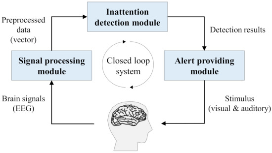 A brain computer interface (BCI) is a system that allows direct communication between human brain and external devices by translating brain signals into commands [1,2]. After demonstrating that people’s mental status can be observed and adjusted by means of BCI, the coverage of BCI application has expanded nowadays. Specifically, inattention, fatigue, and drowsiness detection became significant subjects since those mental status are deeply associated with accidents in diverse areas [3,4]. Among them, inattention, which is a mental status of decreased attention, arouses wide concern in both academia and industry due to many catastrophic accidents reported to be caused by the inattention [5].