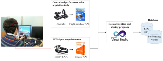 Figure 2 describes the details of the data acquisition step and its output. The data acquisition step utilizes two kinds of input devices, Emotiv EPOC [61] and joysticks. Emotiv EPOC is a commercial device for recording EEG-signal, and it supports wireless connection via Bluetooth communication. Joysticks are used to maneuver a flight in a simulator, and flight simulator API [62] enables the acquisition of sequences of altitude and velocity throughout the maneuvering. Note that the performance values are used as criteria for the attention status of operators with an assumption that the emergence of high variance in velocity or altitude is an indicator of a flight failure due to an operator’s inattention.