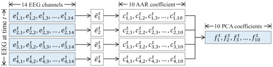 To this end, we adopt AAR coefficients and PCA for the feature extraction and dimensionality reduction, respectively. The overall process is depicted in Figure 4. AAR coefficients are widely used for the feature extraction of sequential data [66,67], and they were firstly adopted to EEG-signal classification problem in Reference [68]. AAR makes an adaptive model to fit data segments, and the model’s coefficients are estimated by using least square methods [67].