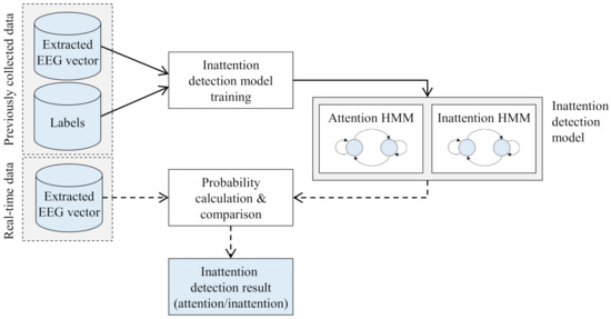 HMM-based inattention detection model consists of two HMMs, attention HMM and inattention HMM. Each HMM is trained by using the corresponding sequences of EEG-signal. For instance, attention HMM is trained by using the sequences of an operator’s EEG-signal, which were generated when the operator is in an attention state.