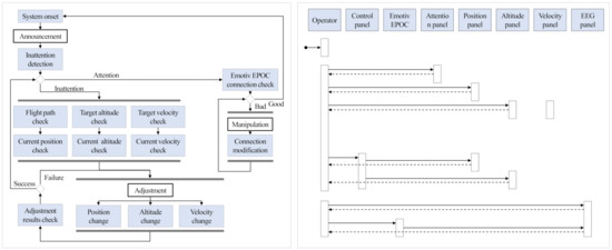 By exploiting the findings mentioned in the previous section, we implemented the attention recovery system for UAV operators. Figure 7 shows the user sequence diagram and flow chart of the proposed system. During a flight, an operator’s attention level is continuously monitored by analyzing EEG-signal acquired from the operator in real-time. When inattention of the operator is detected, an alarm is provided to the operator, and the operator is requested to examine and adjust flight location and performance values. In addition, the system checks the connection with the EEG-signal acquisition device every cycle, and, when a poor connection is detected, a manual adjustment is requested. After the adjustments, the system keeps monitoring the attention level of the operator.