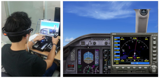 The experimental environment is depicted in Figure 11, where a subject operates a flight simulator (shown in the right image) using joysticks while wearing an EEG-signal acquisition device (shown in the left image). For the acquisition of EEG-signal, we utilized a non-invasive device, Emotiv EPOC manufactured by Emotiv Corporation, as mentioned in Section 3.2.1. The device collects EEG-signal of an operator from 14 channels, AF3, AF4, F3, F4, F7, F8, FC5, FC6, P7, P8, T7, T8, O1, and O2. Emotiv EPOC API enables the real-time acquisition of EEG-signal from a device to a database.