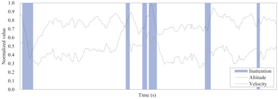 To train an inattention detection model, needs to be labeled as attention or inattention. We assumed that during a failure flight indicates the occurrence of an operator’s inattention status, based on the finding that the occurrence of inattention leads to a performance degradation [74,75]. During an unstable flight, where there exist large fluctuations in performance values, is labeled as an inattention, and it is labeled as an attention during a stable flight, where performance values are successfully kept at a constant level.