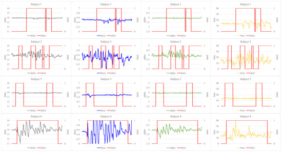Many studies have been conducted on how the EEG signal changes in the inattention state. In particular, there have been attempts to determine the inattention state by representing the EEG-signal in delta, theta, alpha, and beta frequency bands and using values corresponding to each band. However, only theta band’s amplitude was addressed to be consistently elevated in the inattention state [54,55,56,57,58,59], and the directions of change for delta, alpha, and beta in the inattention state were not consistent in the previous studies. Some studies reported an increase in the delta [55,58] and alpha [54,56,59,60] bands’ amplitude, while others reported no change in the delta [56,59] and alpha [58] bands’ amplitude in the inattention state. Moreover, several studies presented that a decrease in the amplitude of the alpha [57] or beta [57,59] band occurs. Each study claimed different aspects, except for theta, so we examine whether our inattention determination method is suitable by measuring theta’s changing pattern in the inattention state.