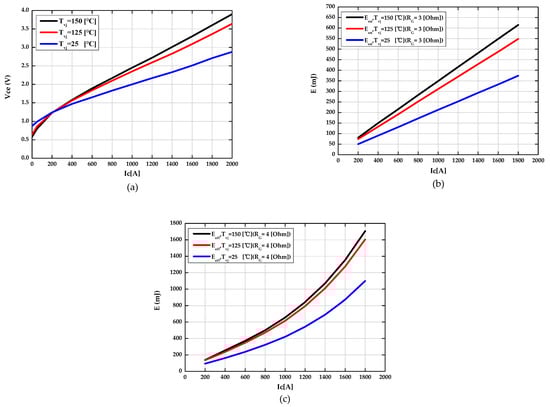 The result of optimization with power loss parameters of an insulated gate bipolar transistor (IGBT). (a) The optimized collector-emitter saturation voltage as a function of collector current at each different junction temperature. (b) The optimized turn-on switching losses as a function of collector current at each different junction temperature. (c) The optimized turn-off switching losses as a function of collector current at each different junction temperature.