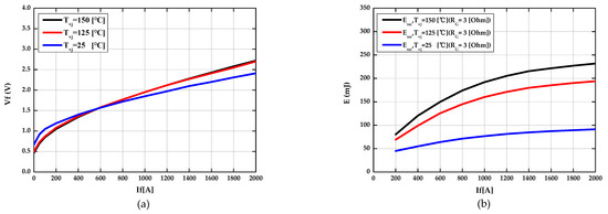 Switching losses of the diode are caused by reverse current in the reverse recovery area of the diode during turn-off. This is dependent on the value of the gate resistor for turn-on, the collector-emitter voltages during turn-off state, and the current flowing through the diode at the forward bias state. In addition, the switching losses energy () optimized for the given inverter was recalculated by utilizing the characteristic curve of the switching losses energy () provided in the datasheet and applied as the look-up table, so it can be calculated according to the current and the junction temperature in real time. The optimized switching losses () is given by Equations (15) and (16) and the results are shown in Figure 4.