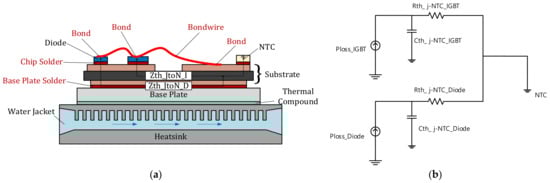 The proposed thermal impedance model from the junction to the NTC. (a) The proposed thermal circuit model shown in a schematic cross section of an IGBT module including the heatsink and water jacket. (b) The proposed thermal equivalent circuit diagram.