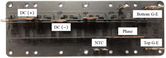 The IGBT module used in this study is a FF1000R17IE4 shown in Figure 1, which provides a package for one phase. Specifically, a substrate with two IGBTs and two freewheeling diodes is arranged in six parallel structures. The power losses of the IGBT module can be explained by the sum of the IGBT power losses and the diode power losses: