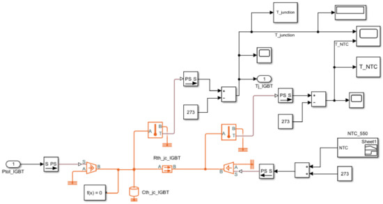 Simulation was performed by implementing the thermal impedance model. The thermal resistance and the thermal capacitance obtained through the experiment were applied in Simulink. The temperature of the NTC was applied as raw data experimentally acquired for each operating condition, and the power losses were calculated from the power loss calculation model designed in Section 2 and applied as the input. There is a disadvantage in that the error present in the power loss calculation model is reflected as the error of the estimated junction temperature, but simulation verification was performed in consideration of this to confirm the reliability of the junction temperature estimation algorithm during the final implementation stage. The thermal impedance model implemented in Simulink is shown in Figure 7, and the simulation results for the operating conditions are shown in Table 3. The error of the estimated temperature for each case was calculated based on the maximum temperature over time, and the maximum error was 1.5% for the IGBT and 1.3% for the diode. The high accuracy of these results indicates that the designed thermal impedance value was close to the actual impedance value and also proved that even a simple thermal impedance model with the NTC as a ground node can obtain sufficient estimation performance.