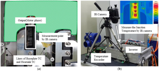 A black paint module was set up on the inverter shown in Figure 8. The junction temperature was measured by the IR camera. The data of the inverter (the estimated junction temperature, the calculated power losses, and the temperature of the NTC) were obtained by the controller area network (CAN) Analyzer with a sampling time of 100 ms.