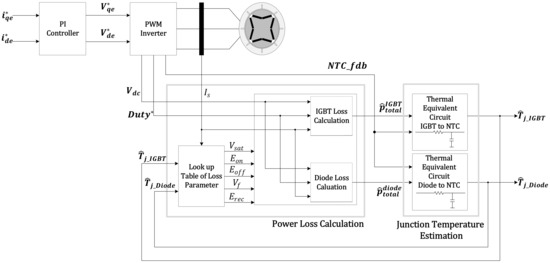 Experimental conditions were selected with the sequence of torque command, the switching frequency, the fundamental frequency, the temperature of coolant, and the DC-link voltage. The block diagram of the proposed junction estimation algorithm is shown in Figure 9. The algorithm has two main functions. One is the thermal impedance model consisting of the thermal resistance and the thermal capacitance from the junction to the NTC. This function needs the results of the power loss calculation function, with each IGBT and diode as the inputs. The other is the power loss calculation function. This function needs the inputs that have the information for power loss parameters (e.g., the phase current, the duty of the PWM, the temperature of the NTC, the switching frequency, and the feedback, as a result of the estimated junction temperature). Finally, the results of this function will be the power losses of the IGBT and diode. These results will be fed back to the function of the thermal impedance model.