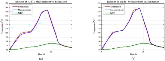 Comparison of estimation results in the driving condition (Case 1). (a) The estimated junction temperature of the IGBT (red), the measured junction temperature of the IGBT (blue), and the measured temperature of the NTC (green). (b) The estimated junction temperature of the diode (red), the measured junction temperature of the diode (blue), and the measured temperature of the NTC (green).