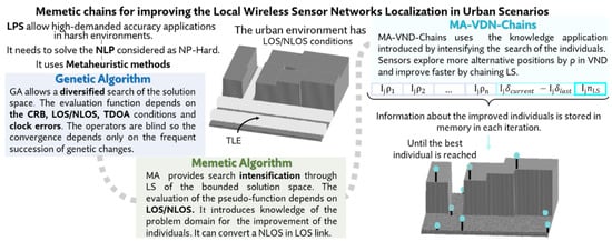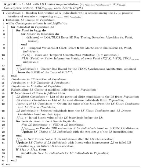 In addition, the new algorithm introduced in this paper, MA-VND-Chains, utilizes a pseudo-function in the LS for reducing the complexity of the fitness evaluation based on the slight variations in the clock and geometric uncertainties of the NLP inside a bounded region analyzed (i.e., neighborhood). This entails the definition of a pseudo-function that exclusively considers the LOS/NLOS paths of the positioning signal among target and architecture sensors in the neighborhood LS. Consequently, the acceleration of the LS calculations enables incremental values of the LS depth and LS frequency for attaining improved results in the NLP.