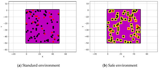 This section explains the properties of the environment upon which the pathfinding algorithms were implemented by creating a simple grid (binary coded) with dimensions of 50 × 50 nodes, which represents a known cluttered environment as shown in Figure 1a. The grid (a simple matrix with 50 × 50 dimensions) is used to represent the environment, where it is occupied with obstacles that are marked as 1, whereas the free spaces are marked as 0. Furthermore, the obstacles were randomly distributed over the grid with discrete values from 0 to 100, which represent their elevations, in addition to the change in their locations and elevations at each new search of the algorithms. Compared to other representation methods, the grid representation method is simple in structure and easy to implement, so it is commonly used as a way to represent the environment for path planning. To increase the integrity of the path, a safety feature (safe zone) with yellow color was augmented around the obstacles as shown in Figure 1b. The elevation of the grid map nodes, which represents E, is classified into three categories, and the severity of their danger on the UAV during the flight is relative to the designated flight altitude of the UAV, which is set to 60 during the implementation of the algorithm “drone_altitude = 60”. The elevation of the gird map nodes is set as follows: