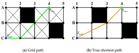 Any-angle pathfinding algorithms are developed to address some of the issues in the standard pathfinding algorithms such as A* algorithm by achieving a short unblocked path from a specific initial point to a specific target point with less computational time. Therefore, one of these issues of the standard pathfinding algorithms that have been addressed by these algorithms is the dissemination of information along graph borders and restrict paths to be constructed by these borders, as shown in Figure 2a. As a result, this restriction makes the resulting paths long and unrealistic looking compared to the actual shortest paths. For that reason, Nash and Koenig [47] developed any-angle algorithms, which disseminate information along graph borders, without restricting paths to be constructed by these borders. They can be utilized to briskly find short paths while retaining the characteristics of the standard algorithms, as shown in Figure 2b. Any-angle algorithms are based on A* algorithm which are namely Basic Theta* [34,35], Angle-Propagation Theta* (AP Theta*) [34,35], Lazy Theta* [36] and Phi* and Incremental Phi* [37] algorithms.