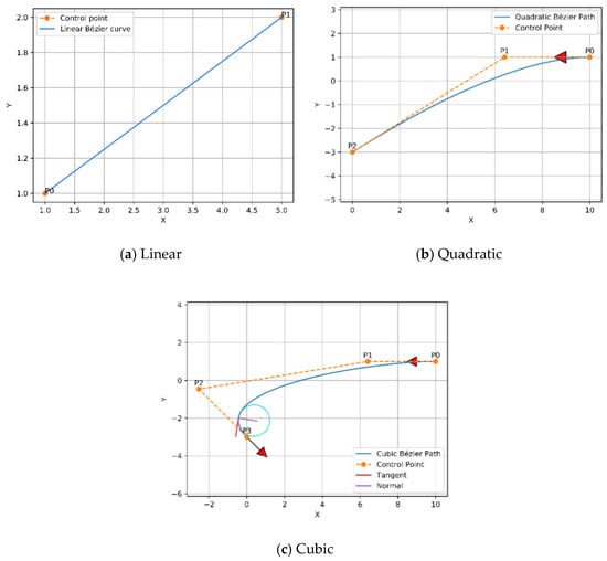 In 1962, the French engineer Pierre Bézier discovered a method of defining curves by control polygons. Based on the principle of approximation, this method constructs a set of special polynomial basis functions, which can effectively describe mathematical curves or sketches drawn by designers. Therefore, Bézier curves are parametric polynomial curves defined by the control points that are considerably employed in computer graphics to create smooth curves. The most frequent examples of Bezier curves applied are linear, quadratic, and cubic, as shown in Figure 3, in order to avoid complex computation and derivation of the high order curves.