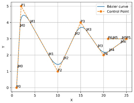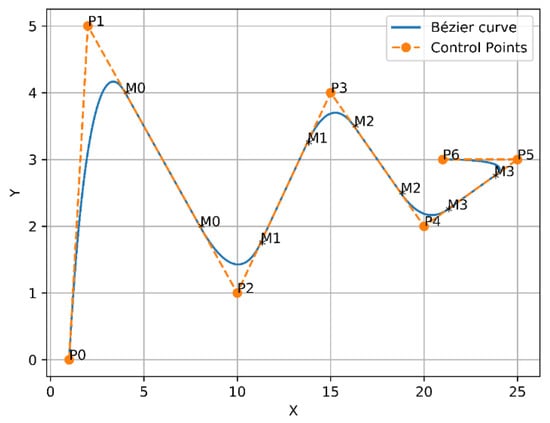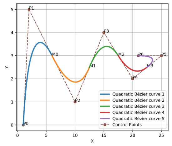 For example, Bézier curve has the following points , where and represent the endpoints. Whereas, and represent the first two control points, while and represent the second two control points and so on. To apply the above solution, a first midpoint is called and is placed between the first two control points to create [, , ]. Next, a second midpoint is placed between the second two control points to form [, , ], and so on. Subsequently, from the first endpoint towards the first midpoint , the first quadratic Bézier curve will be formed. After that, from to , the second quadratic Bézier curve will be created as well. The two previous quadratic Bézier curves will force derivative continuity as a result of these points being in perfect alignment. The first and second derivatives of Bézier curves according to are presented in Equations (8) and (9). Finally, this way will continuously follow the same previous approach until arriving at the final endpoint. Thus, from the first endpoint to the final endpoint, a smooth curve was constructed, as shown in Figure 4.