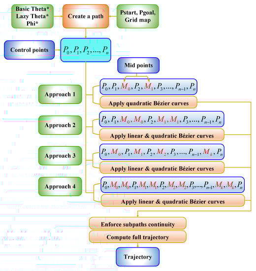 As previously mentioned in Section 3.1, the most frequent examples of Bézier curves have been utilized (linear, quadratic, and cubic curves) to avoid the monotonous and exhausting computation processes. In the same section, it is also mentioned that constructing these curves strictly depends on the control points, which are the waypoints of the generated paths. It is evident that the constructed paths from the aforementioned pathfinding algorithms will contain numerous waypoints, and therefore there will be many control points that require massive mathematical operations. In fact, the curves of Bézier guarantee a significant degree of resiliency and the cost of calculation is insignificant, as they are based on polynomials that were created utilizing the appropriate control points. If the degree of the curves has risen, the previous characteristics commence disappearing when the control points number is large. A proper solution has been introduced by finding a midpoint between each two control points on each segment of the constructed path. The endpoints and control points of the curve will be connected with these midpoints by adopting quadratic Bézier curves. As a result, the final trajectory will be constituted of several joined curves. This method will guarantee an uncomplicated and efficient way to draw a curve for an innumerable number of control points. This method is achieved by using an array of points, where the points are inserted in this array and then passed to the function, thus intense and complicated mathematical operations will be avoided.