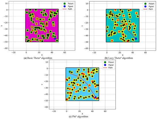 The unblocked paths of the modified any-angle pathfinding algorithms, which are Basic Theta*, Lazy Theta*, and Phi*, have been displayed with red color in this section, as shown in Figure 9. The positions of the start and goal points have been located at (5,5) coordinates with a green color and (45,45) coordinates with a blue color within a grid size of 50 × 50 nodes. For more clarification, the color of the nodes indicates that their elevation less than 50 is changed from one algorithm to the other.