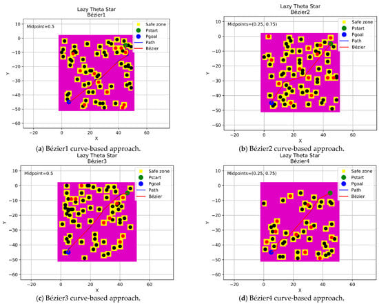 This section displays the design of the flyable trajectories with the Lazy Theta* algorithm using the four Bézier curves-based approaches, as shown in Figure 11. The positions of the start and goal points have been located at (5,45) coordinates with a green color and (45,5) coordinates with a blue color within a grid size of 50 × 50 nodes.