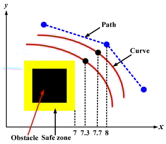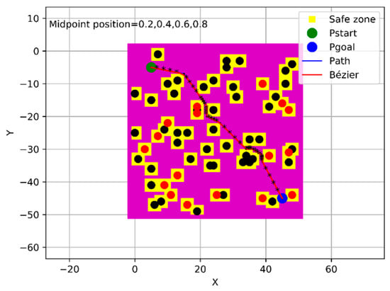 To guarantee more safety to the UAV on the end extremities of the trajectory, an additional single midpoint was placed between the endpoints and control points, as shown in Figure 6. As previously mentioned in Section 2.1, the obstacles are randomly located in the environment, that is, there is no full control on how they will behave or where they will be on the next execution to the algorithm. This may present the possibility of some obstacles close to the resulting trajectory at the final points, which could add danger to the flying vehicle. Therefore, adding a midpoint on the final extremities means adding more control to the trajectory by pushing it towards the path. In this approach, linear Bézier curves were also exploited to connect the final endpoints of the curve with the midpoints. This is because of the final extremities points of the trajectory’s just two points, which are and , and it is inadmissible to utilize quadratic Bézier curves to represent them.