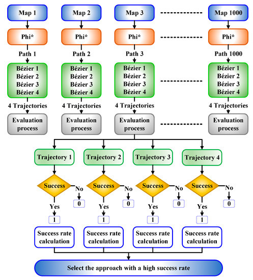 This section answers the questions that have been asked at the end of the previous section in detail by introducing a new and innovative mechanism to evaluate the four approaches, which were studied in Section 3.2. This process aims to find a proper approach that guarantees the construction of a flyable and smooth trajectory from among the four Bézier curves-based approaches that have been proposed. The four approaches were evaluated by applying them to a variety of different size grid maps; the more environments there are, the greater the confidence in knowing whether one of these approaches is effective to be adopted. Consequently, 1000 randomly generated environments were employed to evaluate the four approaches, which are Bézier1, Bézier2, Bézier3, and Bézier4. Additionally, one of the three any-angle pathfinding algorithms in this paper was utilized in each environment beside the four Bézier curves-based approaches with randomly generated obstacles and start and goal points. Due to the research work being scarce on the Phi* algorithm and the fact that it has a lot of room to explore, it will be directly adopted in the evaluation process. After that, a validation mechanism was constructed for each operation that takes place in each environment, which includes (path and trajectory design) examining their rate of success. After generating the path and the four trajectories on each environment, this mechanism checks each point along each constructed trajectory with a rounding process.