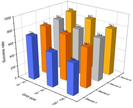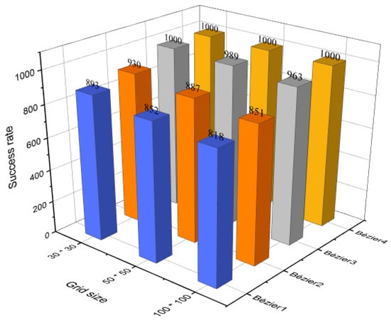 The evaluation process is performed by creating a 4 × 1000 matrix. Each row of this matrix represents one of the Bézier curves-based approaches, while each column will include the evaluation result (success rate) for each whole operation on each environment. As a result, if the rounding process has proven that the whole constructed trajectory from the starting point to the goal point is far from the safety feature, set 1 in the corresponding matrix position, otherwise 0.