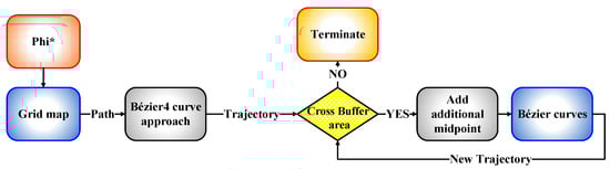 After the evaluation process was conducted on the four Bézier curves-based approaches, it was found that the fourth approach is the most suitable to be adopted in designing the trajectory compared to the three other approaches, since it showed high success rates, as shown in Figure 15 and Figure 16. To reach the optimality in generating a safe and smooth trajectory, a new algorithm has been proposed to work with the Bézier4 curve approach. This algorithm suggests adding further midpoints, which guarantees to increase the safety of the generated trajectory with a very high success rate and generate an optimal trajectory far from the yellow buffer area. To illustrate the work of the proposed algorithm, a schematic diagram of the algorithm is presented in Figure 17.