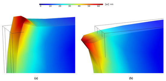 Figure 3 shows the resulting surface deformation under compressive (positive) and tensile (negative) prescribed in-plane displacements of nm, where the wavelength and decay rate were set to m and . Varying the prescribed displacement within this range, the relationship between and the peak surface deformation was found to be linear.