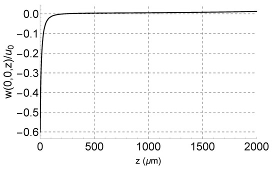 Assuming that the vibrometer-measured displacement represents the average surface deformation within the field illuminated by the spot, Figure 5 can be used to estimate the decay rate r given the spot size. In our case, the laser beam spot size was measured as 9 m. An FEM simulation was then employed to identify the decay rate r, where the average of the deformation ratio over the initial 9 m along the z-axis was the same as that evaluated experimentally. It was found to be . This is reasonable considering that the metallization of the IDT enhances the confinement of the wave to the substrate surface [40].