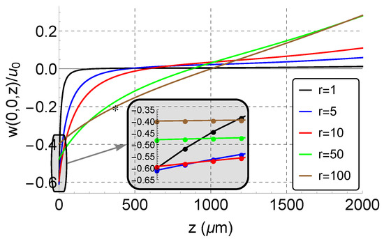 The decay rate of the deformation field depends on the type of SH-SAW, the substrate properties, and the boundary conditions. This rate determines the degree of the SH wave’s localization to the substrate surface. To determine whether variation in the decay rate may impose further limits on the proposed experimental technique, we compare in Figure 5 the normalized deformation along the fingertip mid-line for a range (r = 1–100) of decay rates. It was found that the surface deformation resulting from less-confined shear waves decays at a slower rate. For , the surface deformation drops to half value at m, which is marked with an asterisk in Figure 5. The linear relationship between the peak in-plane displacement and the peak surface deformation also changes from at to at . Highly confined surface waves exhibit a higher deformation ratio , but require a smaller laser spot.