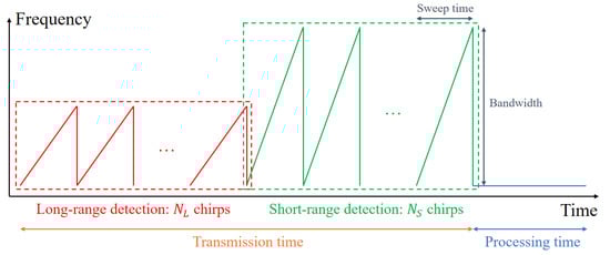 Figure 2 shows the time-frequency slope of the FMCW radar signal transmitted at each frame in our radar system. One frame defined in this study is the basic time unit of radar signal processing, which consists of signal transmission time and signal processing time, and its total length is 50 ms. As shown in Figure 2, multiple waveforms whose frequency increases linearly with time are transmitted sequentially within the transmission time. To increase the range resolution while miniaturizing the antenna system of the radar, the millimeter wave band was used. In addition, waveforms with a relatively narrow bandwidth are used for long-range detection, whereas waveforms with a relatively wide bandwidth are used for short-range detection. In our radar system, based on the center frequency () of 62 GHz, 1.5 GHz and 3 GHz are used as bandwidths for long-range detection and short-range detection, respectively. In general, the range resolution of the FMCW radar signal is determined by [9], where c and B represent the speed of light and the bandwidth, respectively. Thus, the range resolution for each mode is 10 cm and 5 cm, respectively. In the case of short-range detection, a wider bandwidth is used to detect nearby objects in high resolution, which means that one object can be detected as more points.