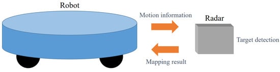 This FMCW radar sensor is mounted on the front of the robot as shown in Figure 3. First, the robot passes information related to the robot’s motion (e.g., the velocity and rotation angle of the robot) to the radar. This robot has a shape similar to a robot vacuum cleaner and can perform linear and rotational motions. Here, rotational motion means that the robot rotates at a constant angular velocity about the central axis. Then, the radar sensor estimates the distance, velocity, and angle information of targets located in the field of view (FOV). Finally, the radar sensor can map the surrounding environment combining the motion information and its own target detection results.