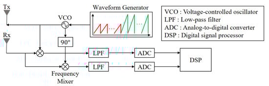 The FMCW radar signal in Figure 2 is radiated through the transmit antenna and then reflected from the target. The received signal includes the time delay due to the relative distance to the target and the Doppler frequency due to the movement of the target. The received signal is converted to a baseband signal by passing through a frequency mixer and a low-pass filter. Then, the baseband signal is sampled in the time domain as it passes through an analog-to-digital converter, as shown in Figure 4.