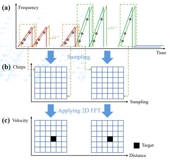 where is the index of the target and is the index of the time sample. In addition, indicates the amplitude of the baseband signal, and and represent the distance to the k-th target and the velocity of the k-th target, respectively. In addition, and denote the sweep time of each chirp and the sampling time, respectively. Then, the time-sampled signals for each chirp can be arranged in a matrix as shown in Figure 5b. In our radar system, and chirps are used in each long-range detection mode and short-range detection mode and N points are sampled for each single chirp, resulting in two matrices of size and . If the fast Fourier transform (FFT) is applied on the sampling axis of the matrix, the matrix data are converted to data on the distance axis. In addition, if the FFT is applied on the chirp axis, it is converted into the data about the velocity axis [14]. In other words, by applying the 2D FFT to the sampled and rearranged FMCW radar signal, the relative distances to the targets and the relative velocities of the targets can be estimated at the same time [18], as shown in Figure 5c. Finally, target detection results in long-range mode and short-range mode are stored every frame.