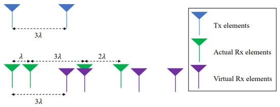Assuming that the spacing between the antenna elements is very small compared to the distance between the radar and the target, almost parallel signals are received at each antenna element. Under this assumption, in the short-range detection mode, the phase values of the signals received from each antenna element become , where is the angle between the radar and the k-th target and is the wavelength corresponding to the center frequency of the FMCW radar signal. Here, the phase value of the first receiving antenna element is set as a reference value, and becomes 4.8 mm because the radar system uses 62 GHz as the center frequency. In addition, the concept of the minimum redundancy linear array can be extended to the MIMO antenna system to achieve high angular resolution [20]. For long-range detection mode, because two transmit antenna elements with spacing are used, more antenna spacing combinations can be generated by the MIMO antenna principle [11]. Thus, the phase values of the signals received by each antenna element become in the long-range detection mode. Figure 6 shows the expansion of the number of receiving channels in the MIMO antenna system. Along with the actual receiving channels, virtual receiving channels are generated by the spacing between the transmit antenna elements. Because the time-division multiplexing scheme [21] is used in the transmission process, transmitted signals can be distinguished at the receiving antenna end.